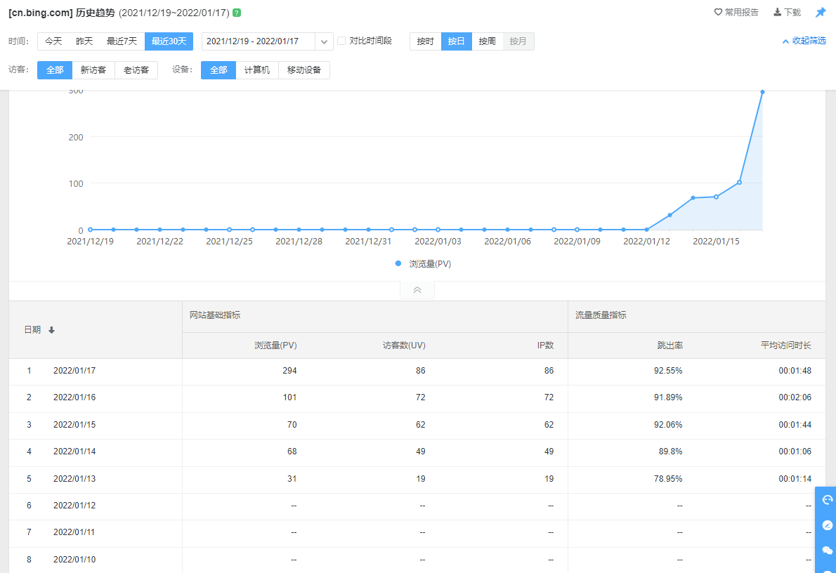 于是又从头开始采集,到今天为止,半个月了,刚好数据上线。查漏了没有答案的题,装上了数据统计,其实没想有人看,只是方便自己用,可最近的数据却告诉我,效果还不错,仔细看了下数据,大多数都是来自bing搜索引擎,百度收录就一条,一点儿不待见这个新站啊。不过没关系,秉着建站的初心,方便自己,也方便他人吧。